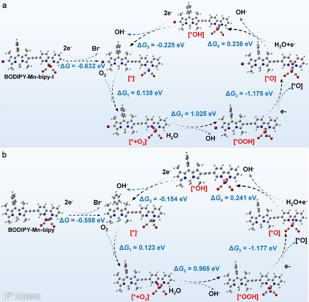 图 7 BODIPY-Mn-bipy-I (a) 和 BODIPY-Mn-bipy (b) 的电催化反应机理。