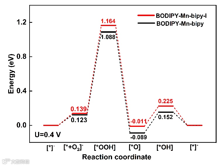 BODIPY-Mn-bipy-I催化剂具有ORR和HER的双功能催化性能,在10 mA cm-2 的条件下,ORR的半波电位为0.84 V,HER的过电位为36 mV。DFT 计算表明,与BODIPY-Mn-bipy催化剂相比,BODIPY-Mn-bipy-I催化剂具有更好的电催化活性和选择性。