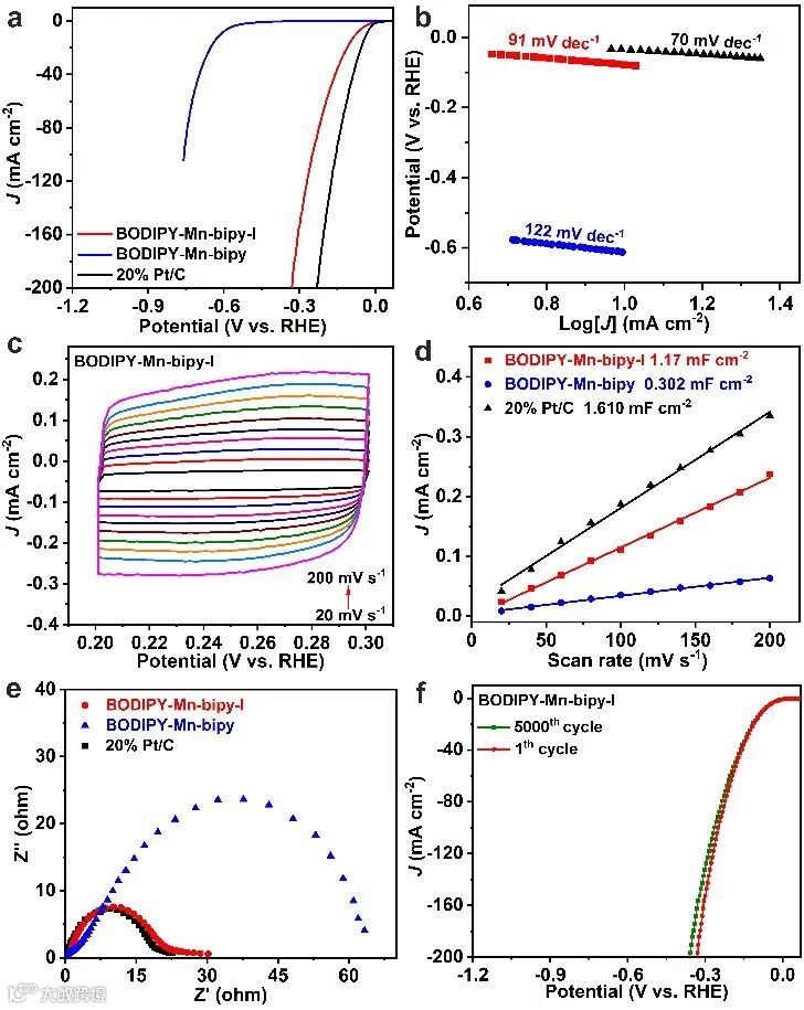 图 5 (a) BODIPY-Mn-bipy-I、BODIPY-Mn-bipy 和 20% Pt/C 的 LSV 曲线和 (b) Tafel 斜率值;(c) BODIPY-Mn-bipy-I 在 1 M KOH 溶液中,扫描速率为 20 至 200 mV s-1 时,0.20 至 0.30 V 对 RHE 的循环伏安图。(d)BODIPY-Mn-bipy-I(红色)、BODIPY-Mn-bipy(蓝色)和 20% Pt/C(黑色)的 Cdl值。(e) BODIPY-Mn-bipy-I(红色)、BODIPY-Mn-bipy(蓝色)和 20% Pt/C(黑色)的电化学阻抗谱。(f) BODIPY-Mn-bipy-I 催化剂在 5000 个循环前后的 LSV 曲线。