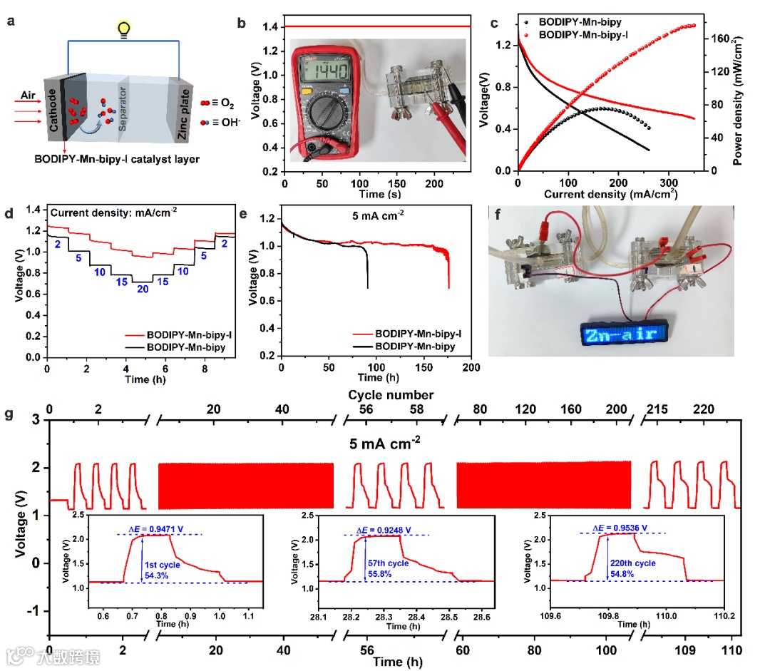 图 6 (a) 锌空气电池的简化模型。(b) 锌空气电池的开路电压图(插图:开路电位照片)。(c) 基于 BODIPY的催化剂的锌空气电池的极化曲线和相应的功率密度曲线。(d) BODIPY-Mn-bipy-I 催化剂锌-空气电池的速率性能。(e) 5 mA cm-2 时 BODIPY-Mn-bipy-I 催化剂(红色)和 BODIPY-Mn-bipy 催化剂(黑色)锌-空气电池的比容量。(f) 由两个 BODIPY-Mn-bipy-I 催化剂锌-空气电池驱动的蓝色 LED 灯的照片。(g) 110 小时内电流密度为 5 mA cm-2 的长期稳定性曲线(插图:锌空气电池开始、中间和结束时的充放电效率)。