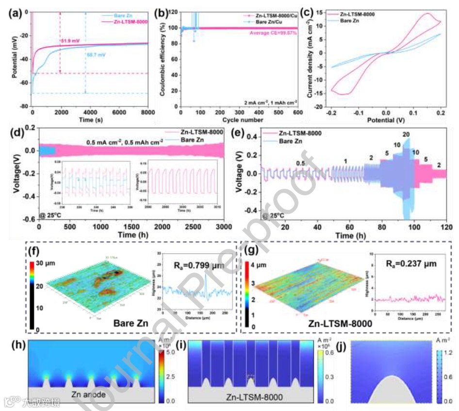图 4. (a) Zn-LTSM 和裸 Zn 负极在 1 mA cm⁻² 下的成核过电位;(b) Zn-LTSM-8000//Cu 和裸 Zn//Cu 的库伦效率;(c) Zn-LTSM 和裸 Zn 负极对称电池的 CV 曲线;(d) Zn-LTSM-8000 对称电池的循环性能;(e) Zn-LTSM-8000 对称电池的倍率性能;(f) Zn-LTSM-8000 和 (g) 裸 Zn 负极在 Zn 沉积后的 3D 形貌图;(h) 裸 Zn 负极和 (i) Zn-LTSM 负极上的 Zn 沉积 COMSOL Multiphysics 仿真;(j) 对 (i) 进行放大的 COMSOL Multiphysics 仿真结果。