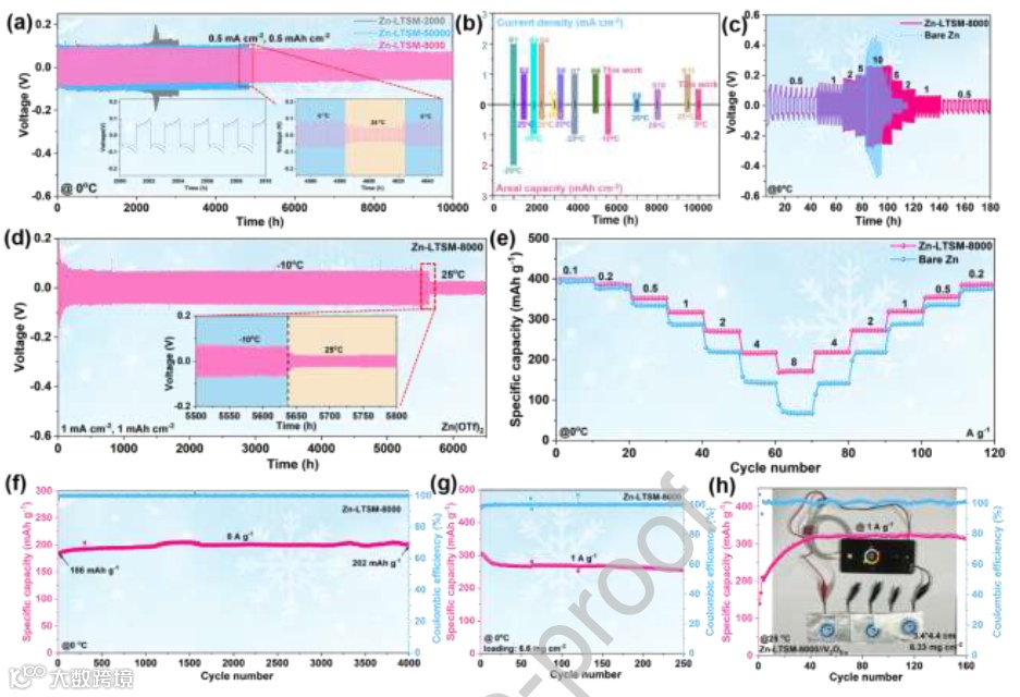 2 在 −10°C 条件下,Zn-LTSM 仍可稳定循环 5000 小时,展现出极强的低温适应性。