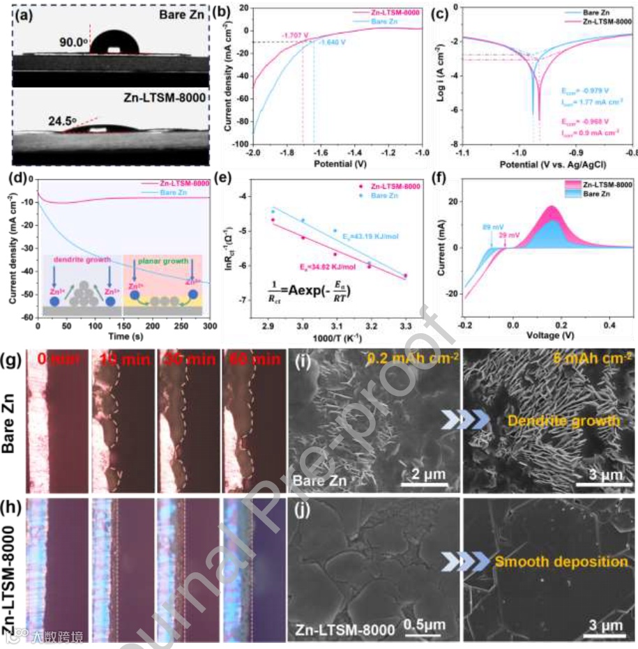 图 3. (a) 水系电解液在 Zn-LTSM-8000 和裸 Zn 负极上的接触角;(b) Zn-LTSM-8000 和裸 Zn 负极的线性扫描伏安曲线;(c) Zn-LTSM-8000 和裸 Zn 负极的 Tafel 曲线;(d) Zn-LTSM-8000 和裸 Zn 负极在 -0.15 V 下的 CA 曲线;(e) 采用 Zn-LTSM-8000 和裸 Zn 负极的对称电池的活化能;(f) Zn-LTSM-8000//Cu 与裸 Zn//Cu 电池的 CV 曲线;(g) 裸 Zn 负极和 (h) Zn-LTSM-8000 负极在不同 Zn 镀覆容量下的原位光学观察。