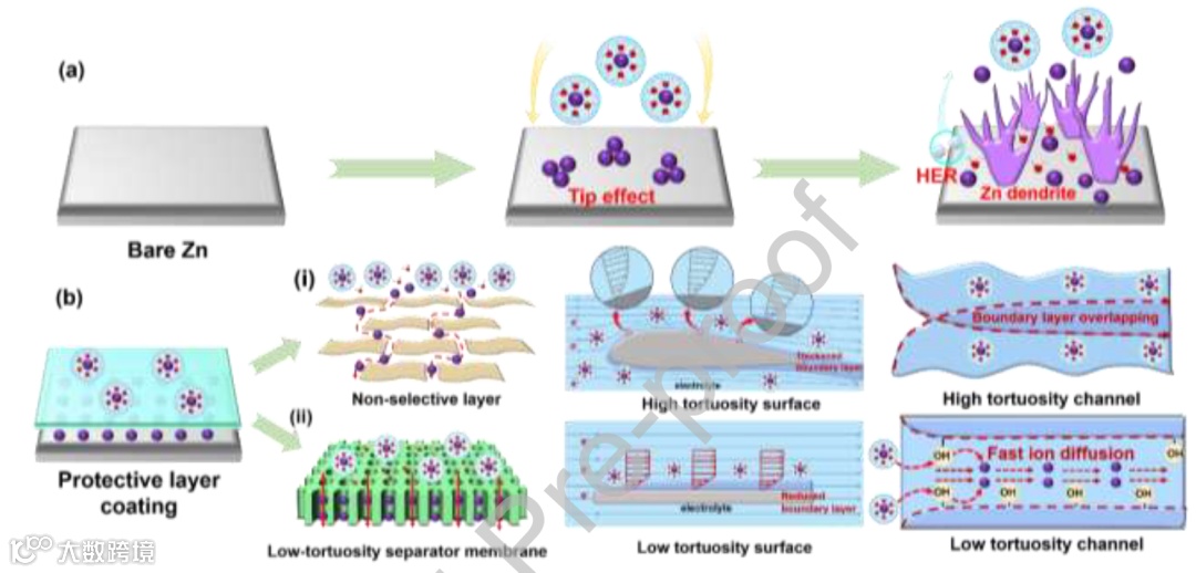 图 1. (a) 裸露 Zn 负极上的 Zn 沉积行为;(b) Zn 负极的保护层涂覆方式:(i) 非选择性涂层;(ii) 低曲折度隔膜。