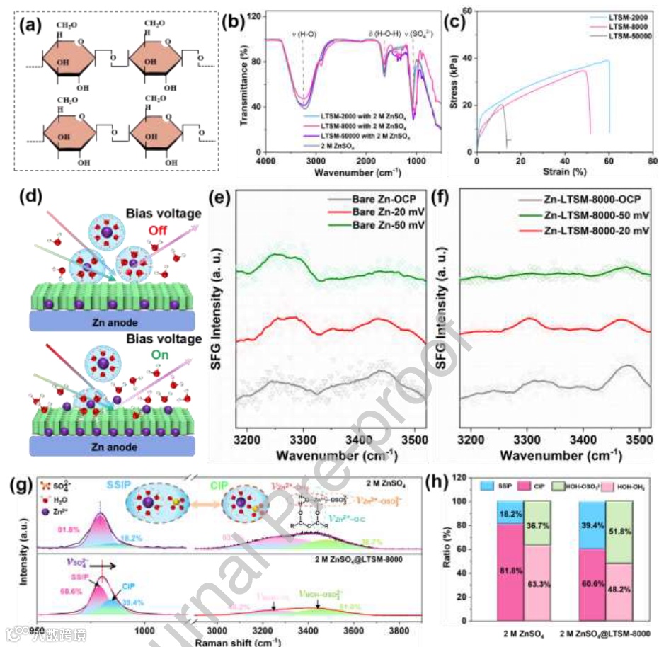 图 2. (a) 低曲折度隔膜的分子结构示意图;(b) 低曲折度隔膜在水系电解液中的 FTIR 光谱;(c) 具有不同分子量截断的低曲折度隔膜的应力-应变曲线;(d) Zn-LTSM-8000/电解液界面在有/无偏压条件下的原位 SFG 示意图;(e) 裸 Zn/电解液界面和 (f) Zn-LTSM-8000/电解液界面在有/无偏压条件下 O-H 键信号的 SFG 光谱;(g) 2 M ZnSO₄ 溶液与 2 M ZnSO₄@LTSM-8000 溶液的拉曼光谱;(h) 不同体系中 SSIP、CIP 及 O-H 伸缩振动的比值汇总。