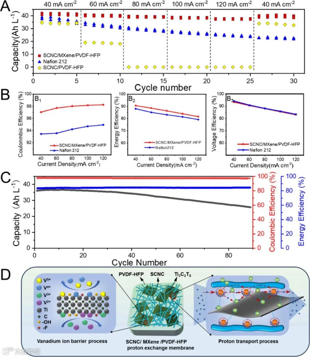 图 4. (A) 使用 SCNC/MXene/PVDF-HFP、SCNC/PVDF-HFP 和 Nafion 212 膜组装的 VRFB 的电流倍率性能。(B) 在 40−120 mA cm-² 电流密度下,SCNC/MXene/PVDF-HFP 和 Nafion 212 的CE、EE和VE。(C) 90 个连续充放电循环评估的 SCNC/MXene/PVDF-HFP 膜的循环稳定性,反映了其放电容量、CE 和 EE (100 mA cm-²)。(D) SCNC/MXene/PVDF-HFP 质子交换膜的钒离子屏障过程和质子传递过程的示意图。