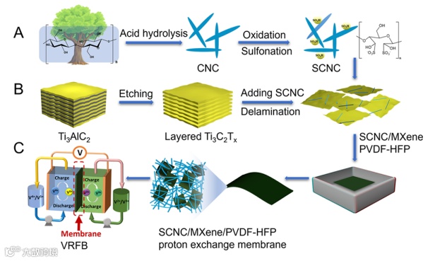 Scheme 1. 用于全钒液流电池(VRFB)的 SCNC/MXene/PVDF-HFP 质子交换膜制备示意图。