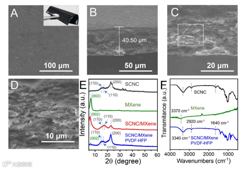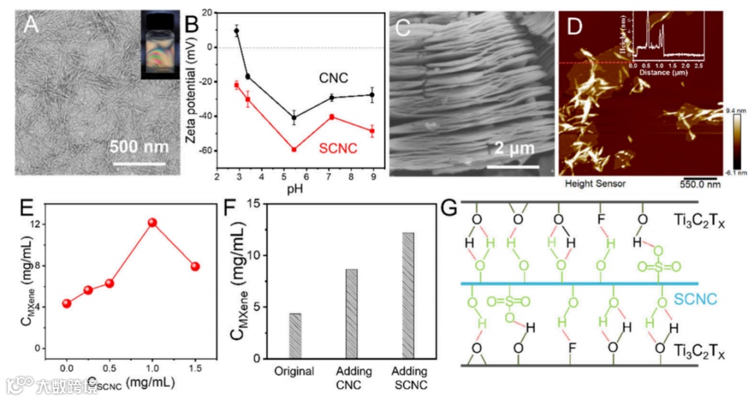 图 1. (A) SCNC、MXene以及 SCNC/MXene纳米组装材料的合成与表征。