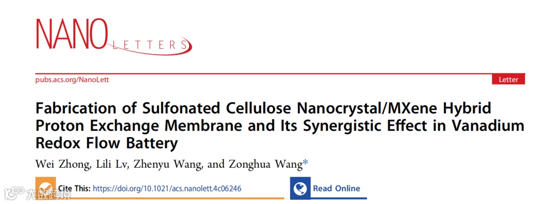基于此,来自青岛大学的王宗花教授团队在国际知名期刊Nano Letters上发表题为“Fabrication of Sulfonated Cellulose Nanocrystal/MXene Hybrid Proton Exchange Membrane and Its Synergistic Effect in VanadiumRedox Flow Battery”的研究。通过在聚偏二氟乙烯-六氟丙烯(PVDF-HFP)聚合物基体中引入磺化纤维素纳米晶SCNC/MXene复合材料,设计并制备了一种新型质子交换膜。该膜表现出低钒离子渗透率(4.92 × 10-⁹ cm² min-¹)、较高的质子电导率(15.8 mS cm-¹)以及优异的离子选择性(3.21 × 10⁶ S min cm-³)。SCNC 与 MXene 纳米片的协同作用显著提升了 VRFB 的整体性能,在 40−120 mA cm-² 电流密度范围内,库仑效率达到 97.0% 至 98.2%,电压效率达到 83.07% 至 93.44%,能量效率达到 81.6% 至 90.7%,均优于商业 Nafion 212 膜。SCNC/MXene/PVDF-HFP 混合膜在各项电池性能上均表现优异,有望成为 VRFB 质子交换膜的理想候选材料。