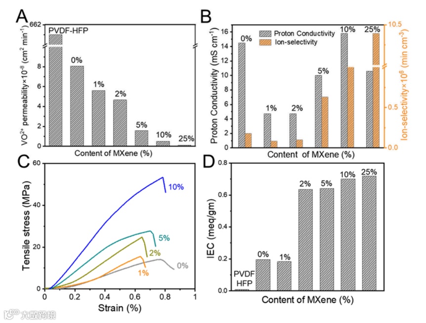 图 3. SCNC/MXene/PVDF-HFP 混合质子交换膜(A) 72 小时内的钒离子渗透率。(B) 质子电导率与离子选择性。(C) 拉伸应力-应变曲线;(D) 离子交换容量。