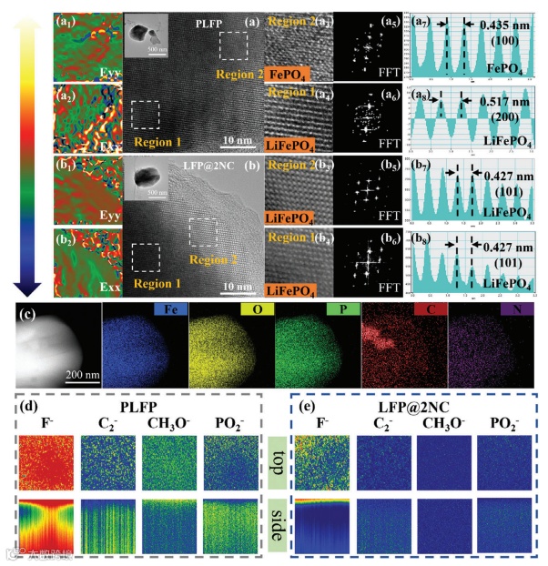 对循环后的样品进行HRTEM测试与TOFSIMS测试,以分析其结构与表面成分的变化。由HRTEM看出,PLFP样品中出现磷酸铁和磷酸铁锂两相,而LFP@2NC样品中则仍是单一的磷酸铁锂相,表明PLFP样品已出现不可逆相变的情况。并且由GPA分析看出,PLFP的两相界面处呈现更大的拉伸应力,这可能是造成不可逆相变的根源。TOFSIMS则反映了样品表面成分上的差异,可以明显看出LFP@2NC样品表面更少的副反应产物累积。因此,功能性界面层可以通过减小应力应变和抑制副反应产物沉积的两种途径同时调控磷酸铁锂的倍率失效行为。