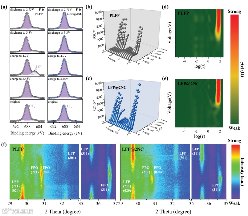 针对功能化界面工程改性机制展开研究,为精细研究首周充放电过程中界面改性的影响,对PLFP和LFP@2NC样品进行非原位XPS测试、原位充电EIS测试及DRT分析、电化学原位XRD测试。由非原位XPS可以发现,LFP@2NC样品在首周过程中并不会出现LiF的信号峰,而PLFP样品中在充电末期出现、放电末期消失的LiF信号则表明其可能存在活性锂反复消耗和表面副产物堆积的趋势。原位EIS和电化学原位XRD都可以看出,界面改性后的材料在相同的充放电条件下展现出更好的循环可逆性,表明其动力学特性的增强。