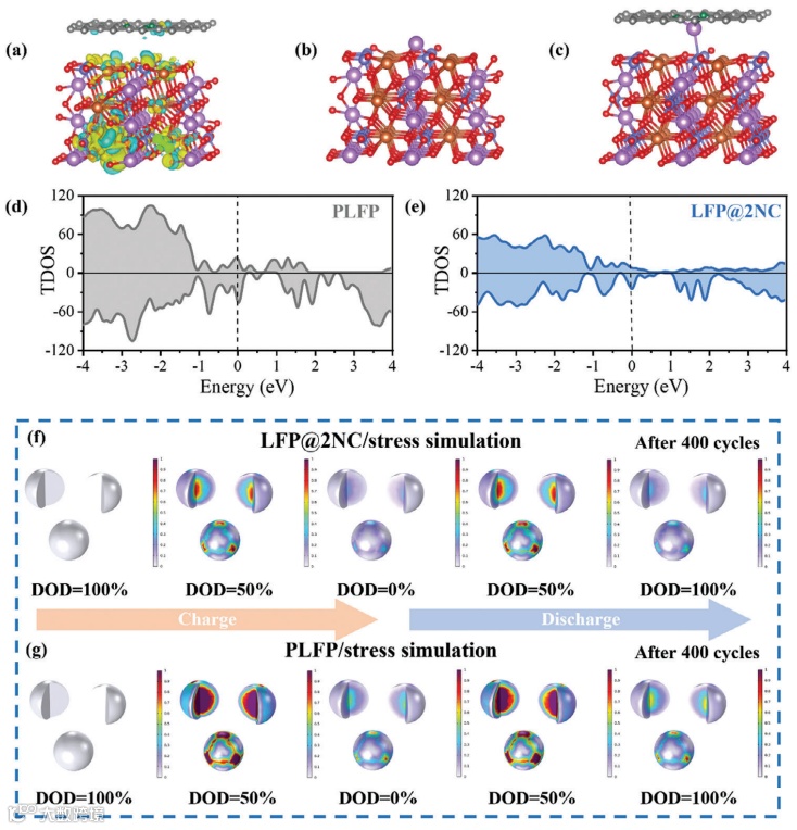 为进一步认识功能性界面工程改性对倍率失效行为调控的作用机制,展开理论计算与模拟仿真。差分电荷密度显示Fe与界面层中的N之间存在电荷交换,Fe-O键的强度可能由此增强,从而赋予磷酸铁锂在高倍率循环下更强的结构稳定性。吸附能计算也证明了N-Li之间的亲和性,这为锂离子的迁移能力增强奠定基础。此外,模拟仿真也有力地证实了功能性界面工程对充放电过程中应力的缓释效果。更强的锂离子迁移能力、更稳定的结构、更小的应力积累,共同赋予了功能性界面对磷酸铁锂倍率失效行为调控的能力。
