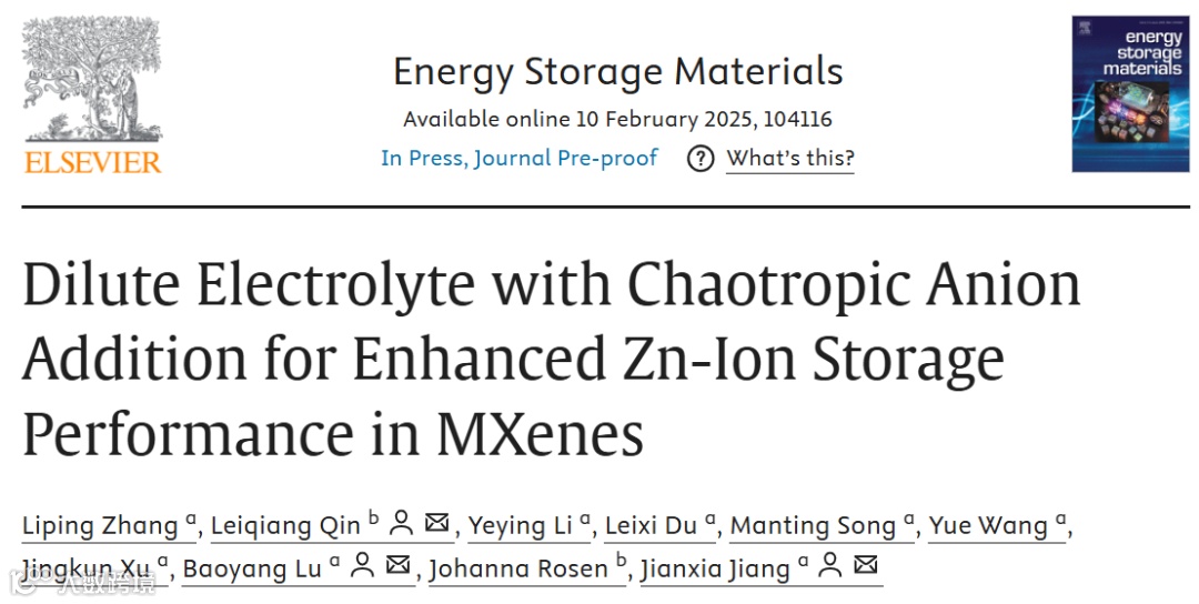 江西科技师范大学蒋剑霞、卢宝阳以及瑞典林雪平大学秦磊强等人提出了一种创新性的低浓度电解质设计策略,通过引入离阴离子作为添加剂,实现了MXene在水系电解质中电压窗口的拓宽,并通过抑制自由水活性和优化锌离子嵌入动力学,提升了MXene的锌离子储存性能。该方法为改善水系电解质中 MXene 基材料的锌离子存储性能提供了通用方案,为开发高功率、高能量密度、环保型 MXene 基电化学储能器件提供了新的研究思路。该成果以题为 “Dilute Electrolyte with Chaotropic Anion Addition for Enhanced Zn-Ion Storage Performance in MXenes”发表在国际知名期刊Energy Storage Materials上。