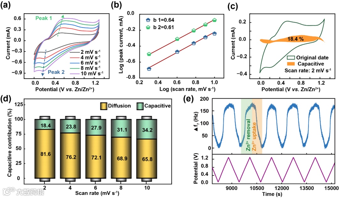 图 3. Zn//Mo2ScC2Tz ZHSCs 在 0.005-1 M 水系电解质中的定量电容分析。(a) Mo2ScC2Tz 电极在 0.005-1 M 水系电解质中的 CV 曲线,扫描速率为 2-10 mV s-1。(b) Mo2ScC2Tz 电极的 log(i) 与 log(v) 之间的线性拟合关系。(c) 在 2 mV s-1 下的 CV 曲线,阴影部分表示电容贡献占比。(d) 在 0.005-1 M 水系电解质中,不同扫描速率下电容贡献与扩散控制电荷的占比。(e) EQCM 分析Zn// Mo2ScC2Tz ZHSCs 在 0.005-1 M 电解质中的电压与频率随时间变化情况。