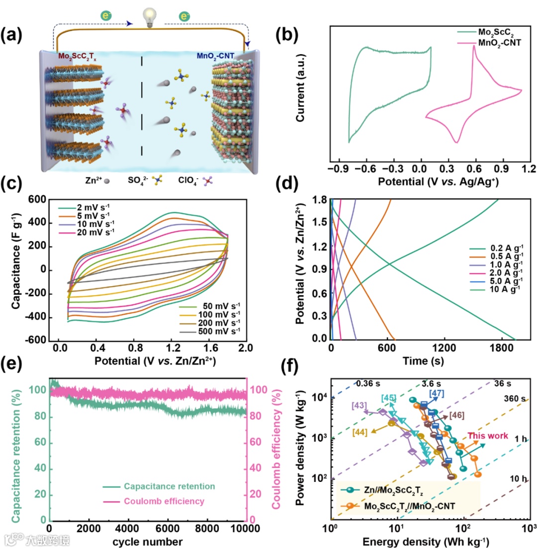 图 5. Mo2ScC2Tz //MnO2-CNT ZHSCs 的电化学性能。(a) 器件的设计示意图。(b) 正负极在 2 mV s-1 时的 CV 曲线。(c) Mo2ScC2Tz //MnO2-CNT 器件在不同扫描速率下的 CV 曲线。(d) 电流密度为 0.2 至 10.0 A g-1 时的充放电曲线。(e) 循环寿命性能。(f) 本研究与已报道的相关研究的 Ragone 图。