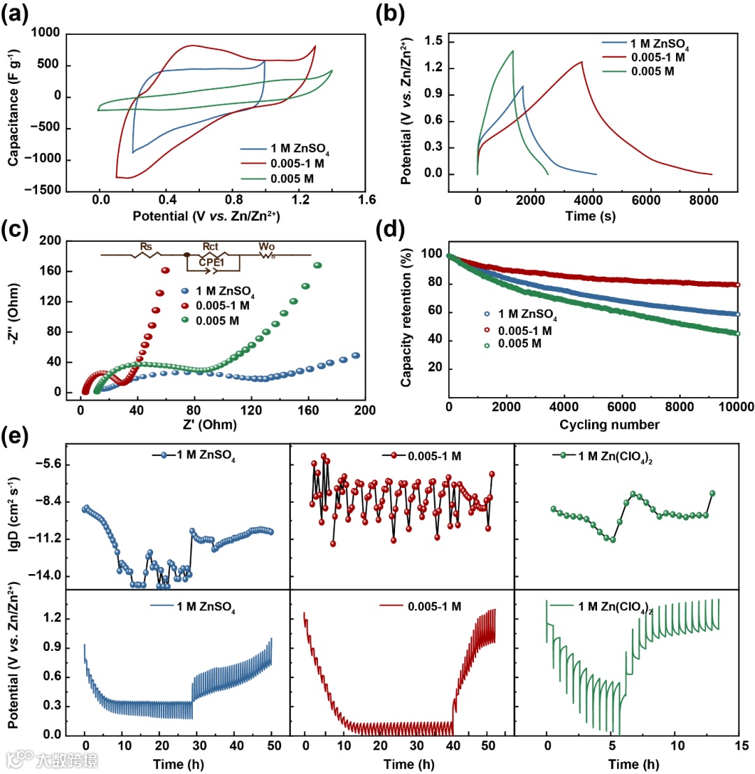 图 2. Zn//Mo2ScC2Tz ZHSCs 在不同电解质中的电化学性能。(a) 2 mV s-1 下的 CV 曲线;(b) 0.2 A g-1 下的 GCD 曲线;(c) Zn//Mo2ScC2Tz ZHSCs 在 1 M Zn(ClO4)2、0.005-1 M 和 1 M ZnSO4电解质中的电化学阻抗谱对比。(d) 循环寿命性能。(e) 电流间歇滴定技术(GITT)测试曲线及基于 GITT 计算的锌离子扩散系数。