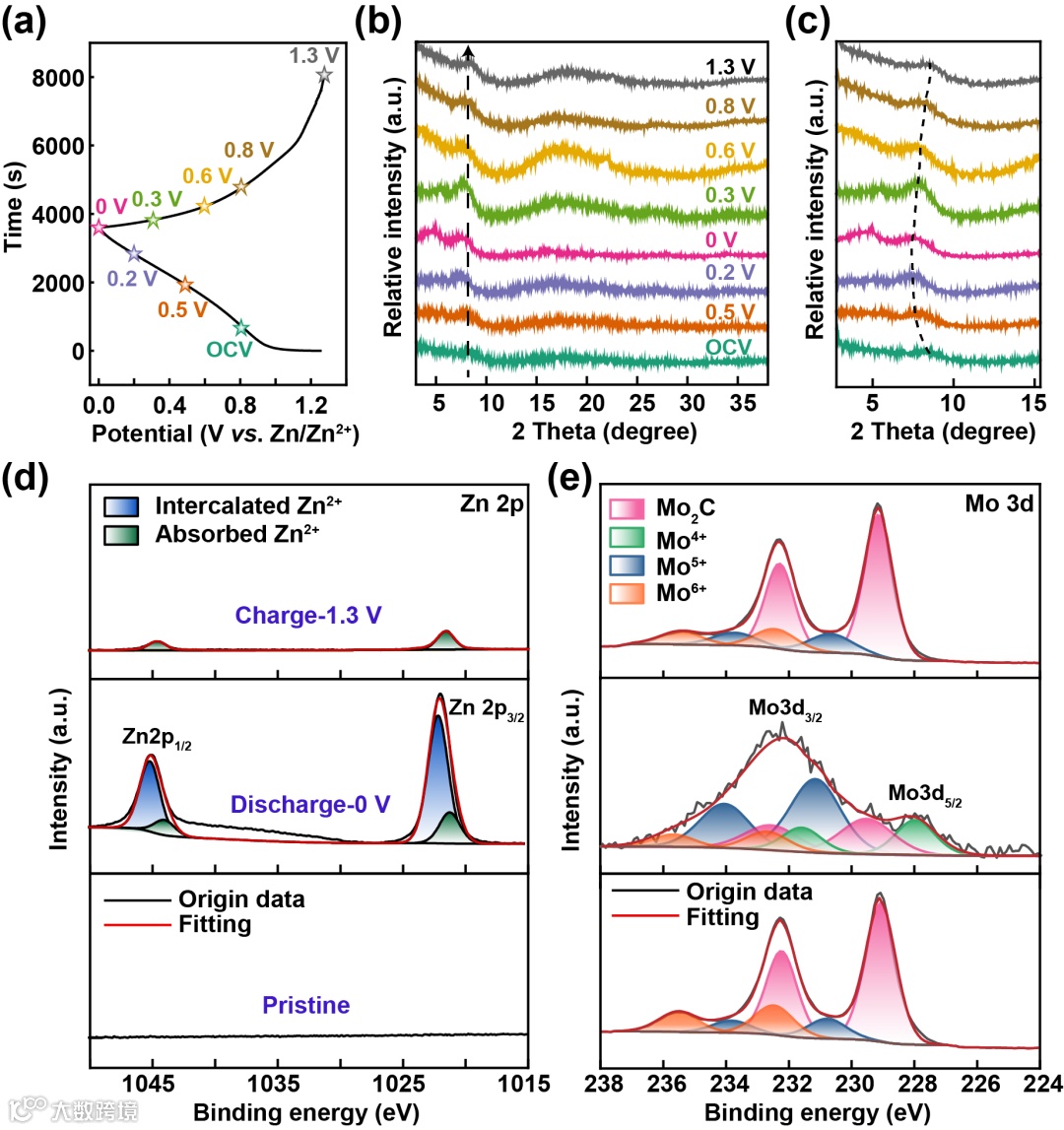 图 4. Zn//Mo2ScC2Tz ZHSCs 在 0.005-1 M 电解液中充放电过程中的 Zn2+ 储存机理研究。(a)电流密度为 0.2 A g-1 时的充放电曲线。(b、c)相应的原位 XRD 图。(d) Zn 2p 和 (e) Mo 3d 的原位 XPS 光谱。