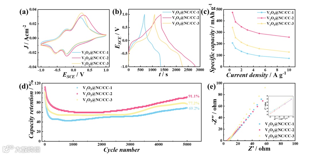 为验证材料的实际应用潜力,研究团队组装了CR2032型锌离子全电池(V2O3@NC/CC-2为正极,锌箔为负极)。结果显示:电池在0.2 A g-1下初始放电容量达393.3 mAh g-1,2 A g-1高倍率下循环2,000次后容量保持率高达87.1%。