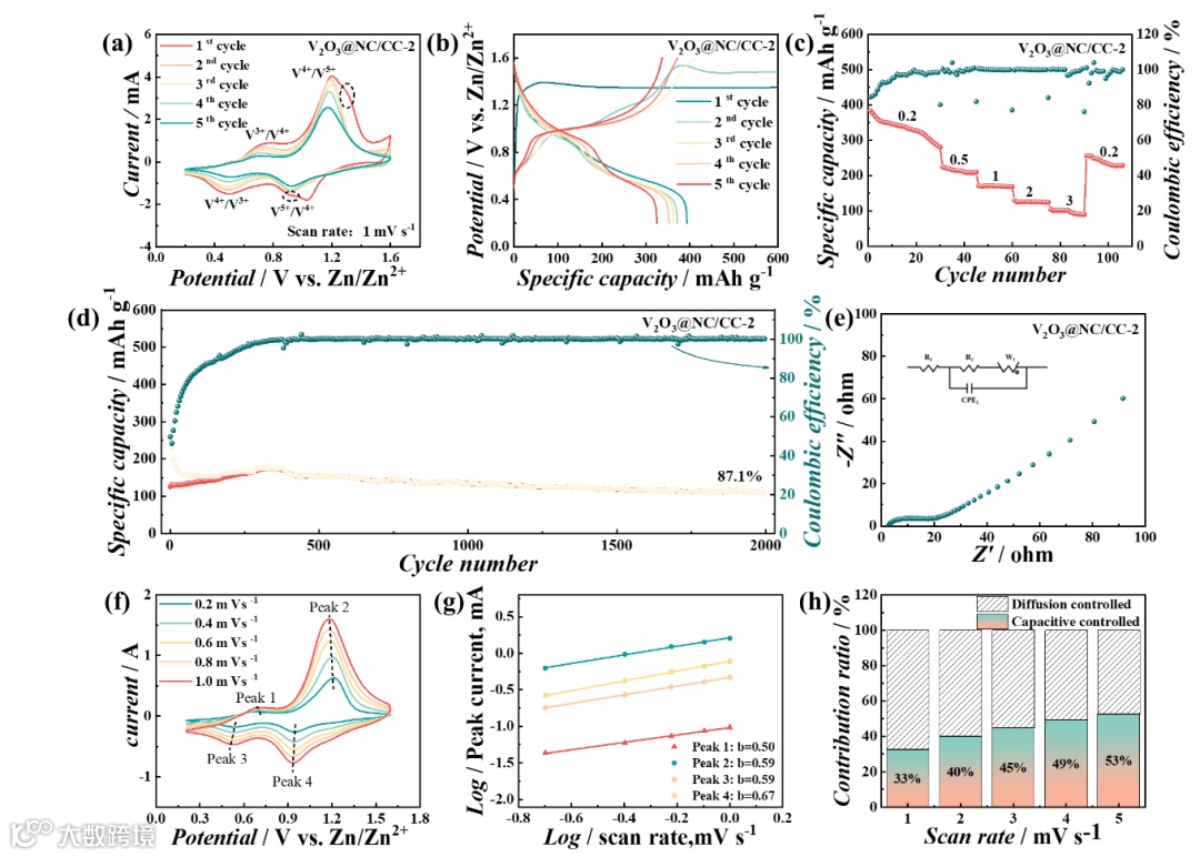 图7.(a)ZIB电池在1 mV s-1扫描速率下,V2O3@NC/CC-2的前5次循环伏安(CV)曲线;(b)ZIB电池在0.2 A g-1下,V2O3@NC/CC-2的恒电流充放电(GCD)曲线;(c)不同电流密度下的倍率性能;(d)ZIB电池在2 A g-1下,V2O3@NC/CC-2的长循环性能;(e)ZIB电池在V2O3@NC/CC-2下的Nyquist图;(f)V2O3@NC/CC-2在不同扫描速率下的CV曲线;(g)V2O3@NC/CC-2的log i与log v图;(h)V2O3@NC/CC-2在不同扫描速率下的电容贡献。