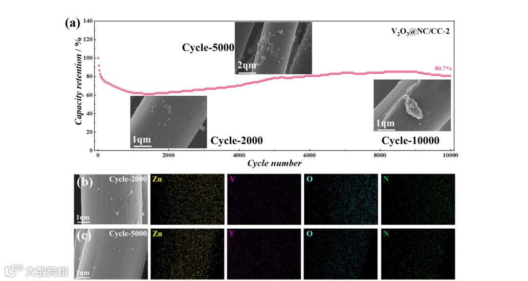 图5.(a)V2O3@NC/CC-2的长期循环性能;V2O3@NC/CC-2 (b)2000和(c)5000 M ZnSO4循环后的EDS能谱图。