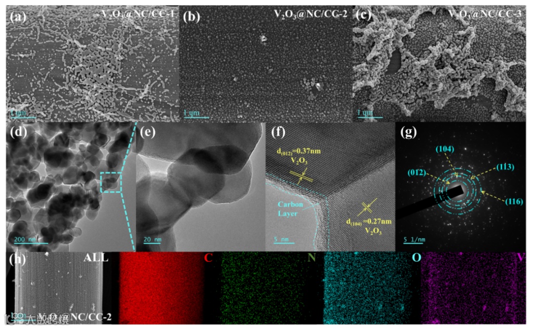 图2.(a-c)V2O3@NC/CC的SEM图像;(d-e)V2O3@NC/CC-2不同放大倍数的TEM图像;(f)HRTEM图像,(g)SAED图像,(h)V2O3@NC/CC-2的EDS元素图像。