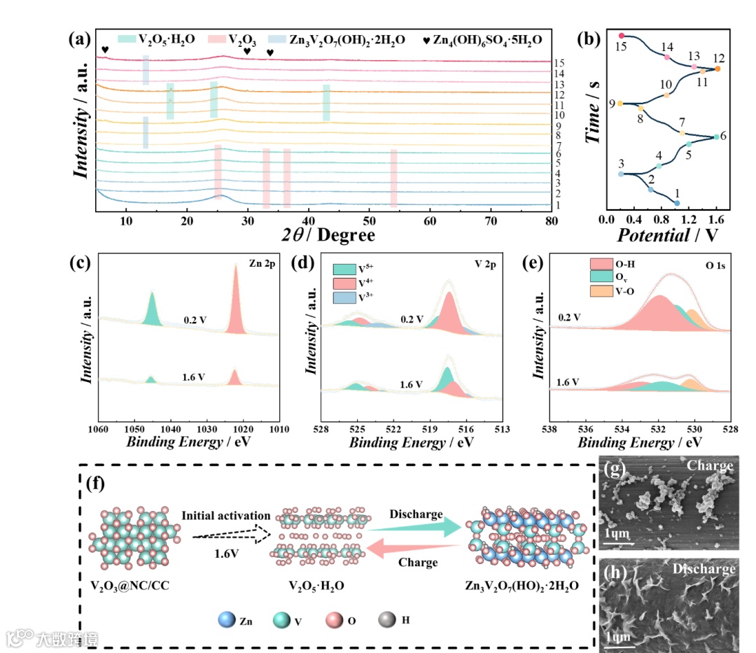 图6.(a)非原位XRD谱图和(b)V2O3@NC/CC-2的对应电位;(c)Zn 2p, (d)V 2p, (e)O 1s在充电/放电状态下的非原位高分辨率XPS光谱;(f)V2O3在放电/充电过程中的晶体结构示意图;(g-h)V2O3@NC/CC-2放电至0.2 V和充电至1.6 V时的非原位SEM。
