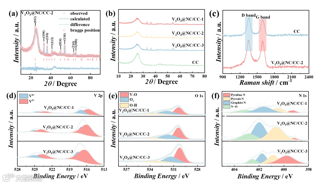 图3.(a)V2O3@NC/CC-2的XRD Rietveld细化图谱;(b)V2O3@NC/CC的XRD图谱;(c)拉曼光谱;V2O3@NC/CC的(d)V 2p;(e)O 1s 和(f)N 1s的XPS光谱。