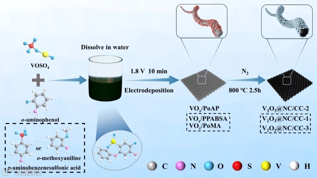 提出了一种同步电沉积策略,在碳布基底上一步实现钒氧化物(VOx)与聚苯胺衍生物(如邻氨基苯酚)的共沉积,并通过后续高温煅烧获得氮掺杂碳(NC)包覆的V2O3纳米球(V2O3@NC/CC)。通过选择含不同官能团(-OH、-OCH3、-SO3H)的苯胺衍生物单体,可灵活调控碳层中的氮掺杂水平与表面化学特性。例如,邻氨基苯酚中的羟基基团可加速电聚合反应速率,形成更均匀的纳米球结构,从而优化电极材料的离子扩散路径与界面稳定性。