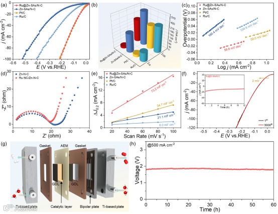 图3. Ru@Zn-SAs/N-C及其对比样品的电催化HER性能测试