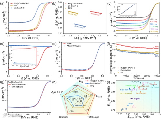 图4. Ru@Zn-SAs/N-C及其对比样品的电催化ORR性能测试