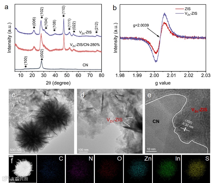 图2. (a) XRD图谱和(b) EPR图谱。(c、d) TEM图像。(e)高分辨率TEM (HRTEM)图像。(f) VZn-ZIS/CN-280%的元素测图。