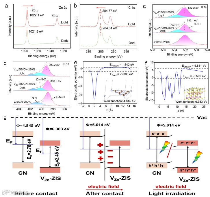 图3 (a) Zn和(b) c的VZn-ZIS/CN-280%的原位高分辨率XPS光谱和(c) O和(d) N的ZIS/CN-280%的原位高分辨率XPS光谱(e) CN的静电电位和(f) VZn-ZIS; 插图分别为CN和VZn-ZIS模型,用于计算。(g) VZn-ZIS/CN S-scheme异质结的形成及其电荷转移分离机理。