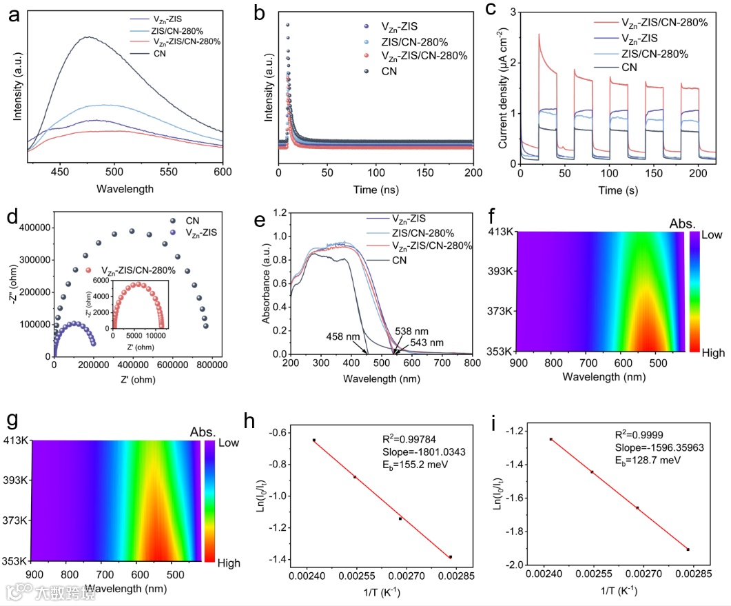 图5 (a) VZn-ZIS、ZIS/CN-280%和VZn-ZIS/CN-280%的PL光谱和(b) TRPL衰减曲线。(c) CN、VZn-ZIS、ZIS/CN-280%、VZn-ZIS/CN-280%光电流响应曲线。(d) CN和VZn-ZIS的EIS图(插图:VZn-ZIS/CN-280%的EIS图)。(e) CN、VZn-ZIS、ZIS/CN-280%和VZn-ZIS/CN-280%制备样品的UV-vis DRS。原位温度荧光光谱:(f) ZIS/CN-280%和(g) VZn-ZIS/CN-280%。经阿伦尼乌斯公式拟合曲线后:(h) ZIS/CN-280%,(i) VZn-ZIS/CN-280%。