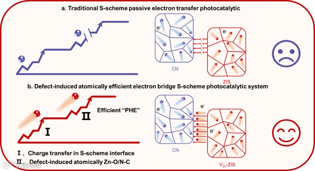 图1. (a) 传统的 S 型被动电子转移光催化系统。(b) 缺陷诱导的原子高效电子桥 S 型光催化系统。