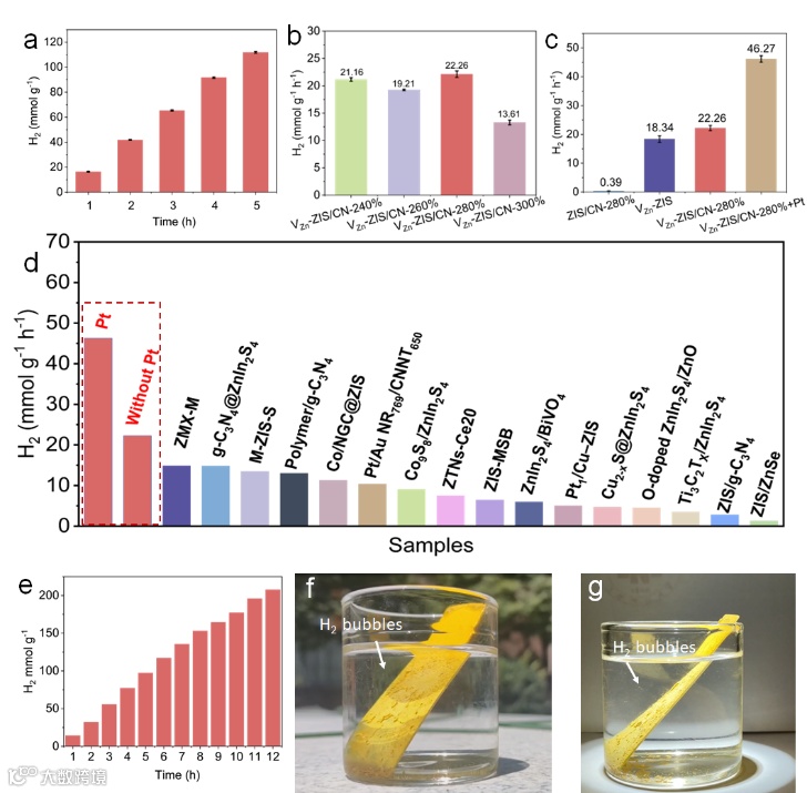 图4 (a) VZn-ZIS/CN-280%在5小时内的光催化析氢。(b) VZn-ZIS/CN-X的析氢速率。(c)不同样品和pt添加条件下析氢速率的比较。(d) VZn-ZIS/CN-280%与最近报道的其他光催化剂H2产率的比较。(e) VZn-ZIS/CN-280%的稳定性试验。(f、g) VZn-ZIS/ CN-280%粗化玻璃膜在自然日光和模拟日光(AM 1.5)下H2析出的数码照片。