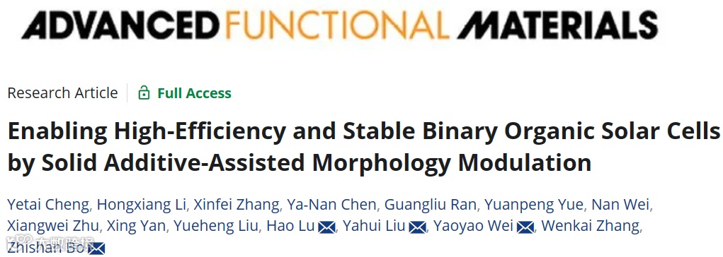 固体添加剂辅助形貌调控实现高效稳定的二元有机太阳能电池