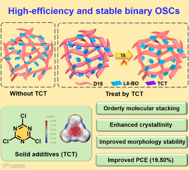 近日,青岛大学薄志山/刘亚辉/路皓&临沂大学韦瑶瑶团队,在国际知名期刊Advanced Functional Materials上发表题为“Enabling High-Efficiency and Stable Binary Organic Solar Cells by Solid Additive-Assisted Morphology Modulation”的文章。该文章介绍了一种在活性层中引入一种固体添加剂2,4,6-三氯-1,3,5-三嗪(TCT),制备出高结晶性和有序性的共混膜形貌的方法。