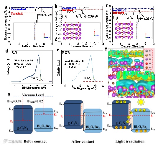 图4. (a-c)模拟计算出的g-C3N4、Bi4O5Br2、g-C3N4/Bi4O5Br2的功函数。红色和蓝色虚线是费米能级和真空能级;(d、e) g-C3N4和Bi4O5Br2的UPS功函数谱;(f) g-C3N4/Bi4O5Br2异质结的电荷密度差。黄色和青色区域代表电子积累和消耗;(g)基于z型异质结的载流子迁移机理示意图。