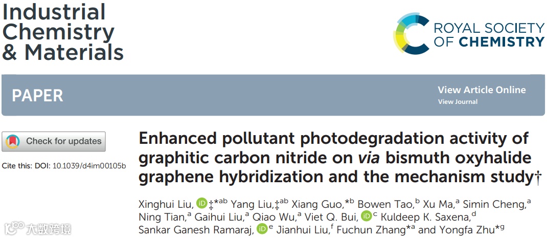 近日,湖北航天化学技术研究所刘性辉教授、延安大学张富春、清华大学朱永法教授团队在期刊Industrial Chemistry & Materials上发表题为“Enhanced pollutant photodegradation activity of graphitic carbon nitride on via bismuth oxyhalide graphene hybridization and the mechanism study”的研究论文,通过将g-C3N4与Bi4O5Br2结合,成功构筑了一种新型的光催化剂。这种材料采用了Z型异质结构设计,有效提升了光生电荷的分离效率和活性反应物种的产生,从而显著增强了污染物的光催化降解效率。
