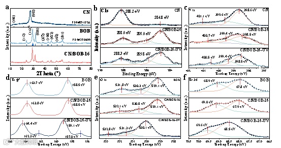 SEM图像显示,BOB由许多微米和纳米级的片状团簇组成,而CN则呈现弯曲的层状结构。BOB的小尺寸颗粒均匀地覆盖在CN的表面,促进了两者之间的紧密接触。TEM图像进一步证实了CN和BOB之间的良好界面接触,高分辨透射电子显微镜(HRTEM)图像揭示了CN/BOB-16的晶体平面,其中晶面间距分别约为0.31纳米和0.33纳米,对应于BOB的(30)晶面和CN的(002)晶面。这些详细的形貌表征结果证实了CN和BOB之间成功构建了预期的异质结构,这种结构有利于光生电荷的分离和传递,从而显著提高了材料的光催化性能。