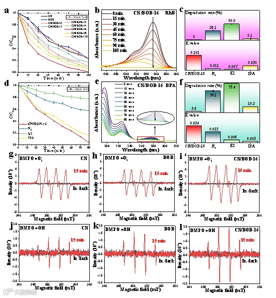 图5. (a) RhB和(d) BPA浓度(C/C0)与光降解时间的关系;(b) RhB和(e) BPA溶液在不同时间催化剂反应后的紫外-可见吸收光谱;添加捕集剂前后CN/BOB-16 ((c) RhB和(f) BPA)的降解速率斜率和降解程度;(g-i) DMPO -·O2−和(j-l) DMPO -·OH在可见光下产生的CN、BOB和CN/BOB-16的EPR信号。
