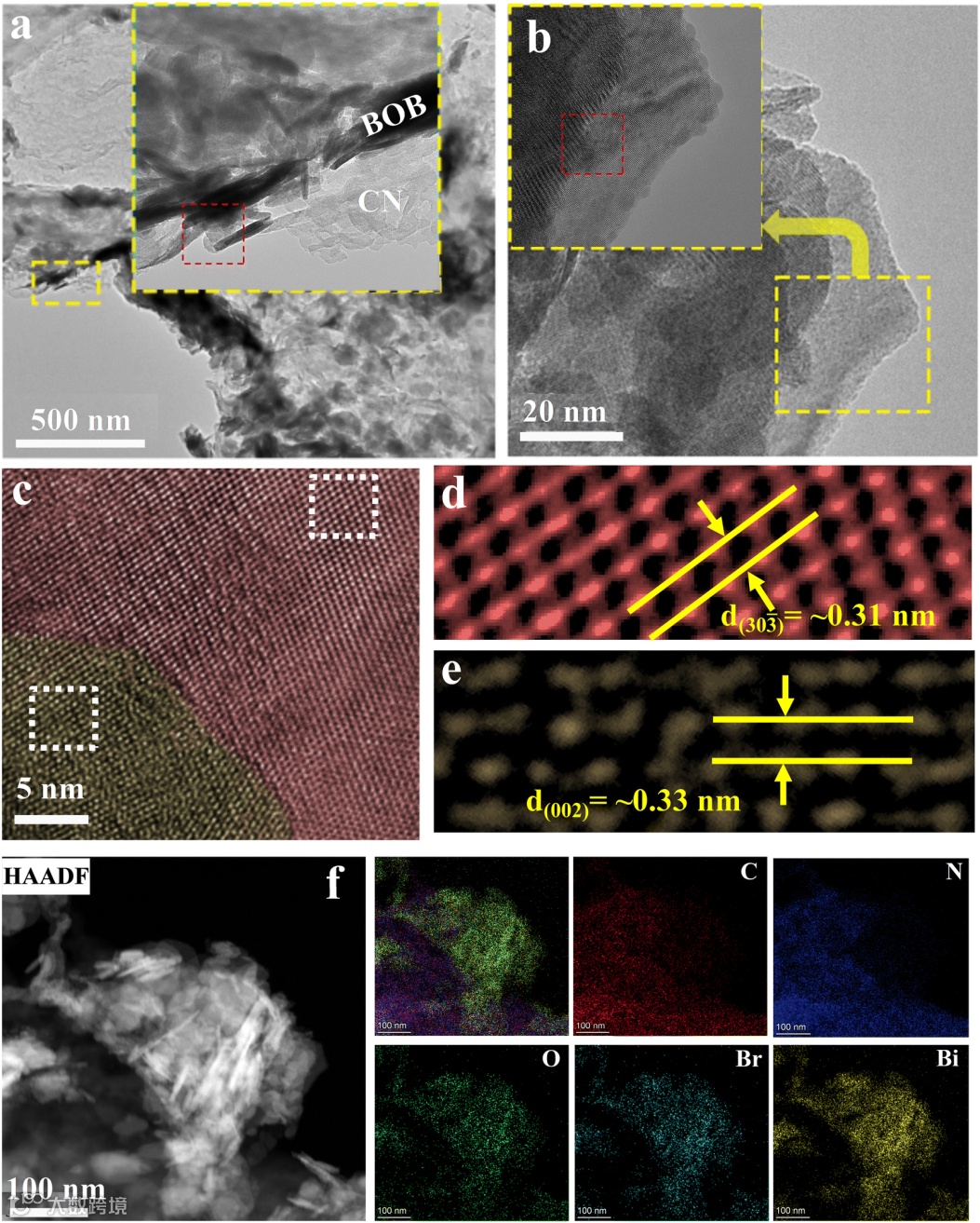 图2. g-C3N4/Bi4O5Br2的TEM形貌分析。(a-e) TEM图像;(f) TEM-EDS元素映射图像。