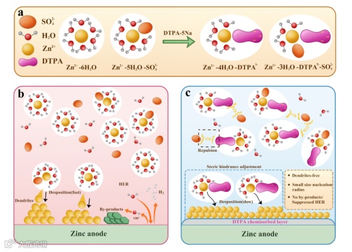 要点二:由于DTPA的引入,使形成的全新溶剂化结构拥有原先两倍以上的尺寸以及更大的脱溶活化能,这缓和了原本Zn2+快速且混乱的电沉积过程,更小的锌临界成核半径以及有序的沉积过程造就了平坦且均匀的锌负极形貌。