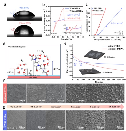 图3 (a)普通ZnSO4电解质与DTPA-ZnSO4电解质在锌箔上的接触角。(b)普通ZnSO4电解液和DTPA-ZnSO4电解液Zn||Cu半电池的CV曲线。(c)使用普通ZnSO4电解质和DTPA-ZnSO4电解质计算Zn||Zn对称电池的交换电流密度。(d)使用普通ZnSO4电解质和DTPA-ZnSO4电解质在EDL中沉积Zn2+的溶剂化结构的电子转移重组能的图形表示。(e)在−150 mV固定电位下,使用普通ZnSO4电解质和DTPA-ZnSO4电解质的Zn||Zn对称电池的CA曲线。(f)普通ZnSO4电解质和(g)DTPA-ZnSO4电解质在恒流和不同容量下Zn沉积形貌的SEM图像。