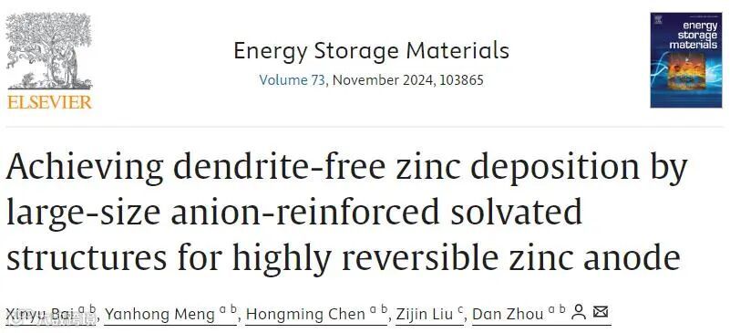 近日,北京科技大学周丹副教授课题组在国际知名期刊Energy Storage Materials上发表题为“Achieving Dendrite-Free Zinc Deposition by Large-Size Anion-Reinforced Solvated Structures for Highly Reversible Zinc Anode”的研究论文。本研究提出了一种全新的阴离子增强Zn2+溶剂化结构,并深度讨论了溶剂化结构特征与副反应以及锌离子电沉积过程之间的关系,这项工作该研究为通过操纵溶剂化结构实现高度可逆锌阳极提供了新的思路。