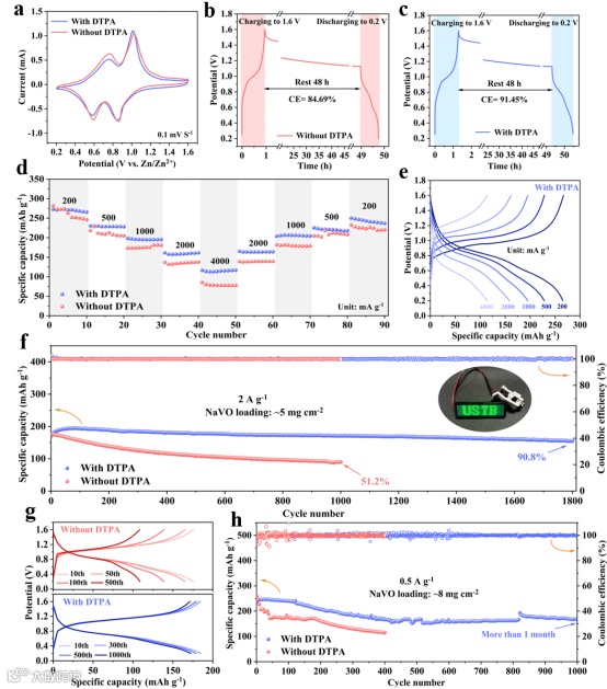 图6 Zn||NaVO全电池的电化学性能。(a)在0.1 mV s-1下,使用普通ZnSO4电解质和DTPA-ZnSO4电解质的Zn||NaVO全电池的CV曲线。使用(b)普通ZnSO4电解液和(c)DTPA-ZnSO4电解液的Zn||NaVO全电池进行自放电测试。(d)使用普通ZnSO4电解质和DTPA-ZnSO4电解质的Zn||NaVO全电池的倍率性能。(e)采用DTPA-ZnSO4电解液的Zn||NaVO全电池充放电曲线。(f)使用普通ZnSO4电解液和DTPA-ZnSO4电解液在2 A g-1、正极材料负载为5 mg cm-2时,Zn||NaVO全电池的长期循环稳定性和(g)相关充放电曲线。(h)采用普通ZnSO4电解液和DTPA-ZnSO4电解液,在0.5 A g-1、正极材料负载为8 mg cm-2时,Zn||NaVO全电池的长期循环稳定性。