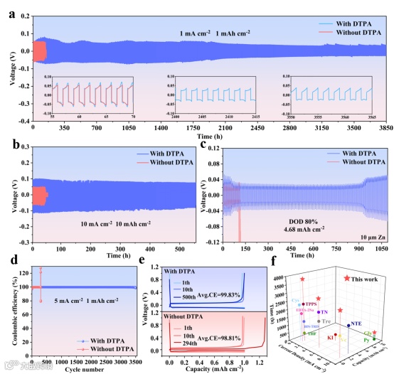 图5 锌阳极的电化学性能。使用普通ZnSO4电解质和DTPA-ZnSO4电解质的Zn||Zn对称电池在(a) 1 mA cm-2,1 mAh cm-2和(b) 10 mA cm-2,10 mAh cm-2下的恒流循环性能。(c)采用普通ZnSO4电解质和DTPA-ZnSO4电解质的Zn||Zn对称电池在高达80% DOD时的循环性能。(d)普通ZnSO4电解液和DTPA-ZnSO4电解液在5 mA cm-2、1 mAh cm-2下Zn||Cu半电池的CE。(e)在5 mA cm-2、1 mAh cm-2条件下,使用普通ZnSO4电解液和DTPA-ZnSO4电解液的Zn||Cu半电池的电压-容量曲线。(f) DTPA-ZnSO4电解液Zn||Zn对称电池循环性能与其他文献的比较。
