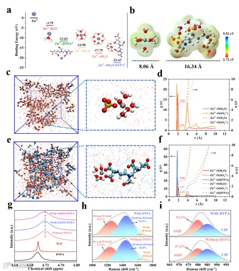 图2 (a)通过DFT计算得到DTPA在电解质中不同结合构型的相关结合能。(b)[(Zn(H2O)6]2+(左)和[(Zn(H2O)4DTPA]3-(右)溶剂化结构的静电电位(ESP)映射及其相关尺寸。(c)普通ZnSO4电解质的MD模拟快照和(d)相关的RDF曲线。(e) DTPA-ZnSO4电解质的MD模拟快照和(f)相关的RDF曲线。(g)纯D2O、DTPA溶液、ZnSO4溶液、含0.04 M DTPA的ZnSO4溶液、含0.08 M DTPA的ZnSO4溶液的1H NMR谱。含/不含DTPA的2 M ZnSO4电解质的(h)氢键和(i) SSIP和CIP的拟合拉曼光谱中峰值面积比。
