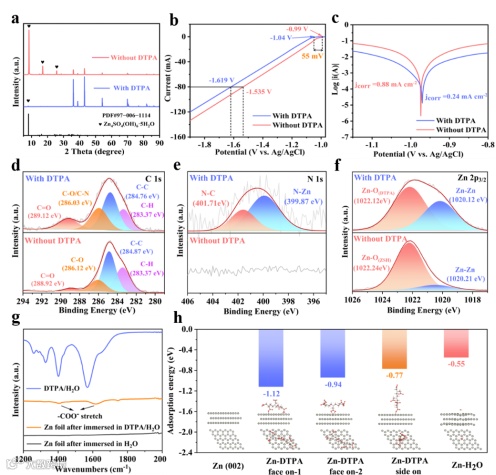 图4 (a)锌箔在普通ZnSO4电解液和DTPA-ZnSO4电解液中浸泡7天的XRD图谱。(b)普通ZnSO4电解质和DTPA-ZnSO4电解质的LSV曲线。(c)普通ZnSO4电解液和DTPA-ZnSO4电解液的Tafel曲线。在普通ZnSO4电解质和DTPA-ZnSO4电解质中浸渍Zn阳极表面的(d) C 1s、(e) N 1s和(f) Zn 2p3/2的高分辨率XPS光谱。(g)锌箔在0.04 M DTPA溶液中浸泡后的FTIR光谱。(h)计算不同构型DTPA和H2O分子在Zn(002)晶面上的吸附能。